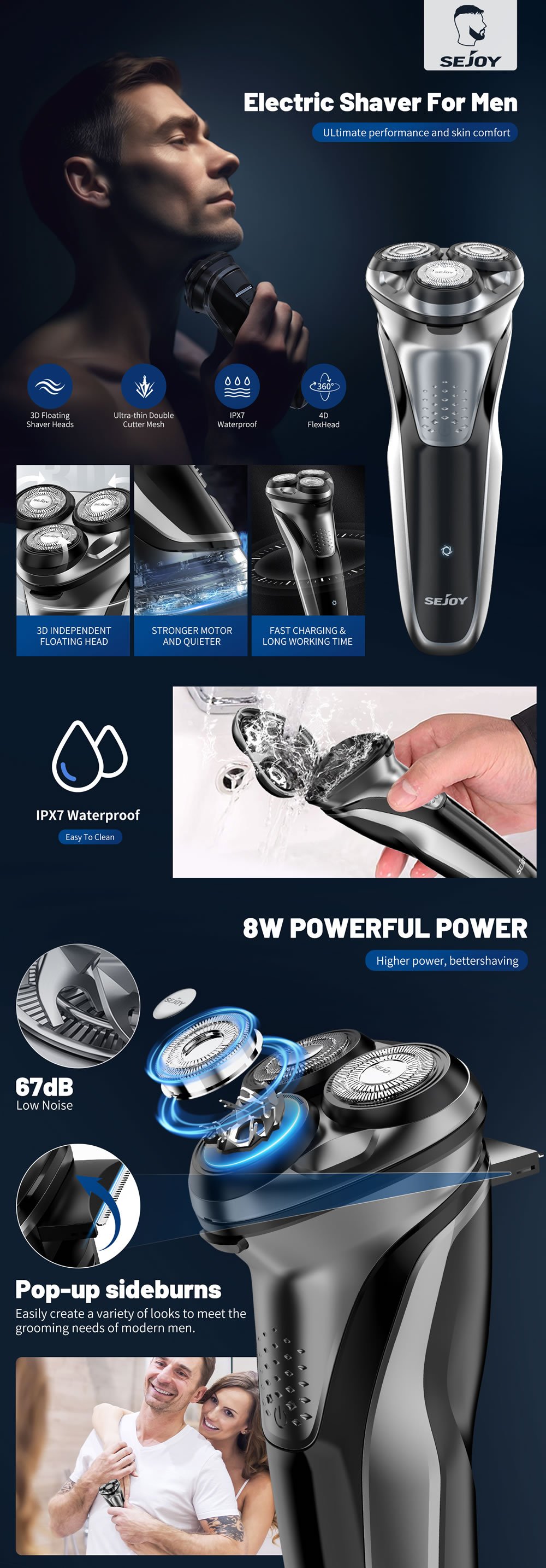 - Precision Power & Quiet Comfort Powered by an advanced ESM intelligent shaving system, the SEJOY® shaver delivers 8W of high-efficiency output, shaving fast, clean, and quiet at just 67dB (well below the IEC standard).