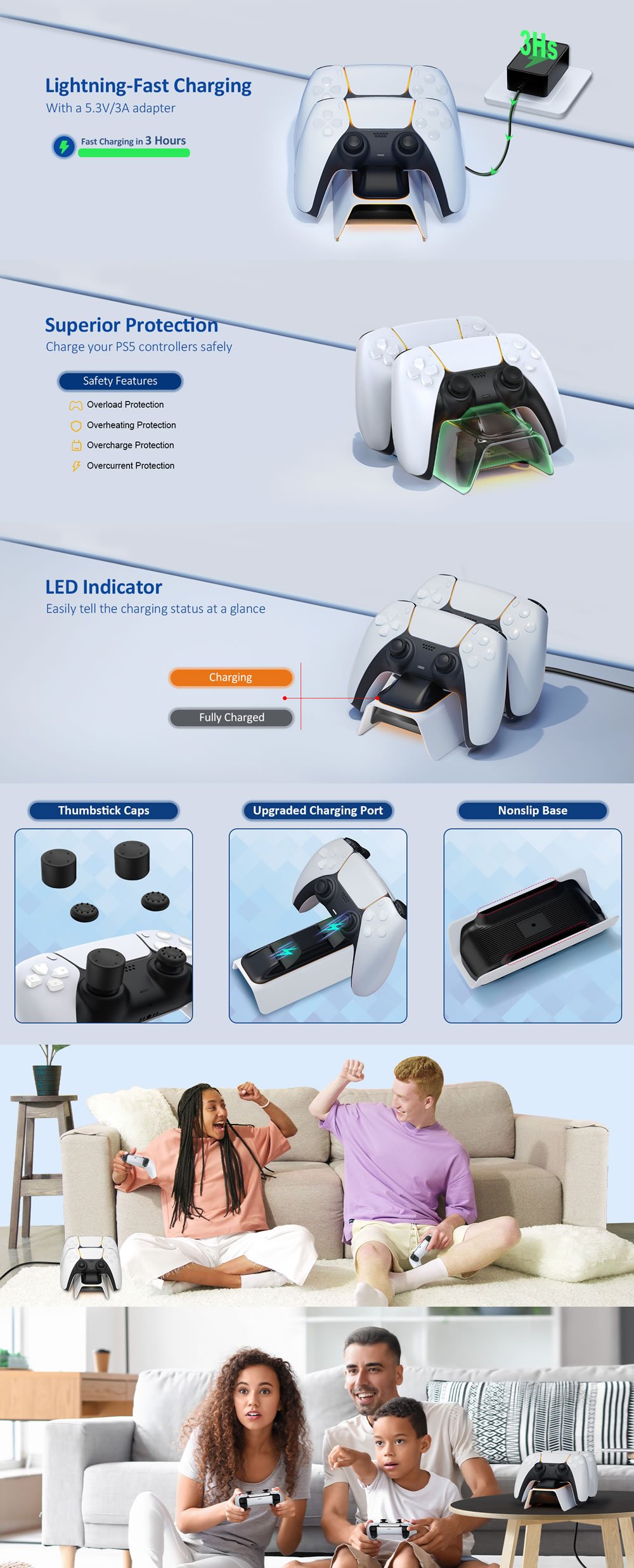 - Fast Charging | Intelligent Protection | LED Indicator. The NexiGo PS5 Controller Charger with Thumb Grip Kit is a must‑have accessory for PlayStation 5 owners, combining fast charging technology, intelligent safety features, and enhanced gameplay comfort.