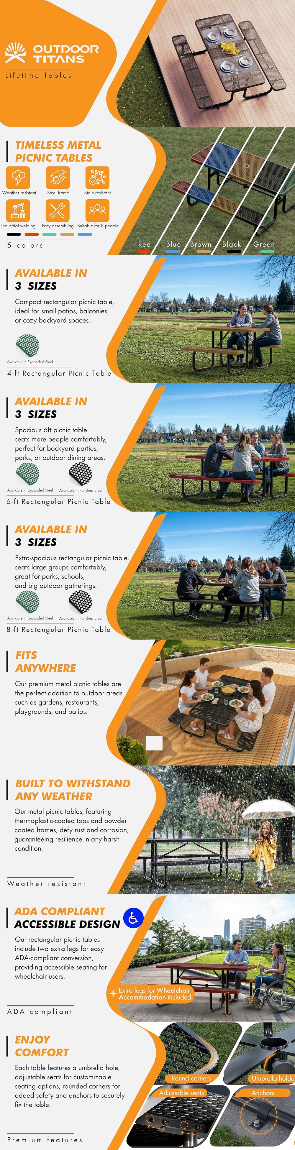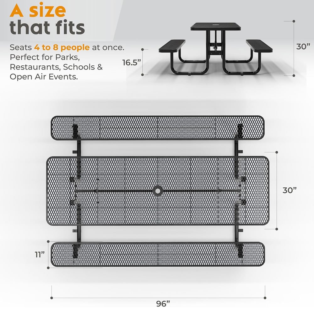 OUTTANS® HEAVY-DUTY METAL OUTDOOR PICNIC TABLE – RECTANGULAR, 8’ | ENGINEERED FOR DECADES OF USE. BUILT FOR SCHOOLS, PARKS, RESTAURANTS, AND BEYOND.