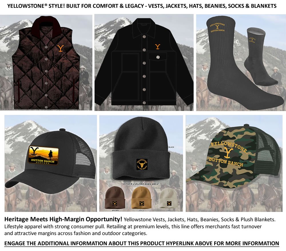 - Designed for both men and women, this assortment of vests, jackets, hats, beanies, socks, and plush blankets embodies the Yellowstone spirit while delivering strong retail appeal and high-margin opportunity.
