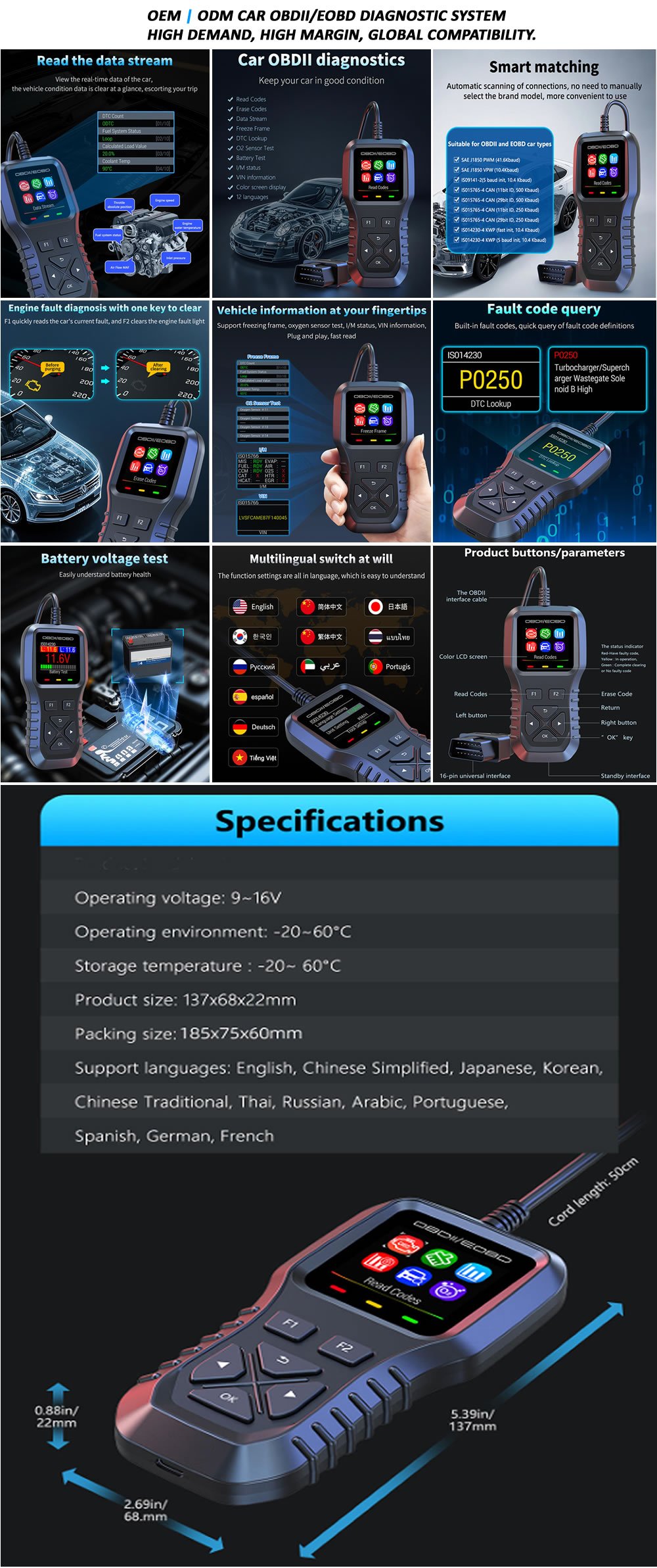 OEM | ODM CAR OBDII/EOBD DIAGNOSTIC SYSTEM | HIGH DEMAND, HIGH MARGIN, GLOBAL COMPATIBILITY.