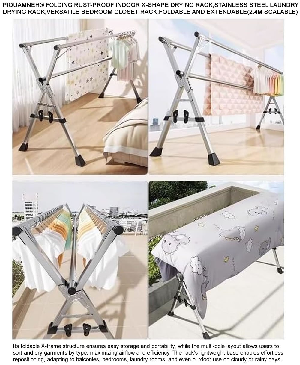 PIQUAMNEH® FOLDING RUST-PROOF INDOOR X-SHAPE DRYING RACK,STAINLESS STEEL LAUNDRY DRYING RACK,VERSATILE BEDROOM CLOSET RACK, FOLDABLE AND EXTENDABLE(2.4M SCALABLE)