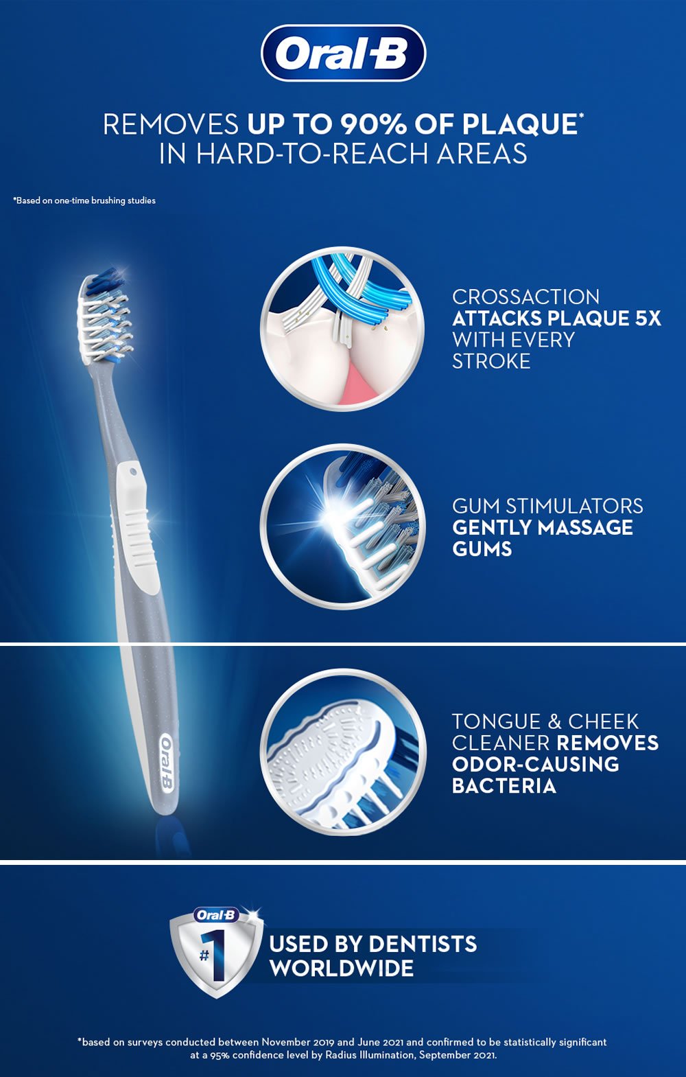 - Superior Plaque Removal Designed with precision-engineered CrossAction bristles, this toothbrush removes up to 99% of plaque in hard-to-reach areas (based on a single-use brushing study). Every stroke attacks plaque effectively, delivering a deep clean that customers can feel.